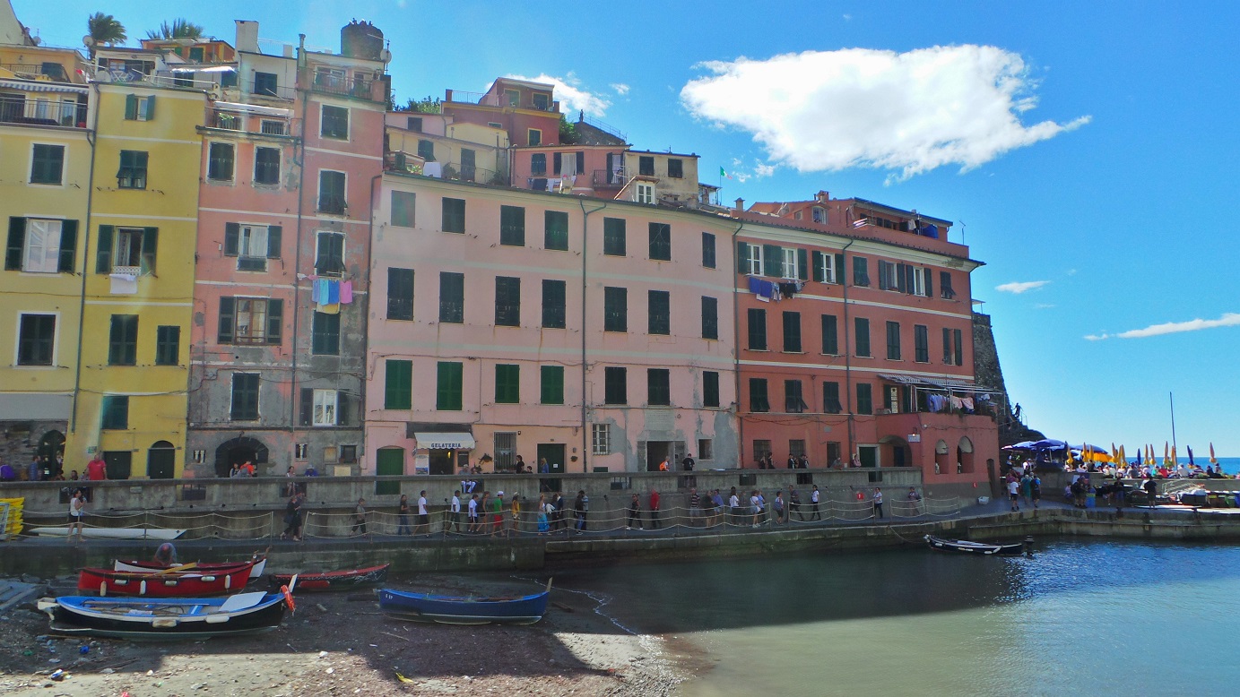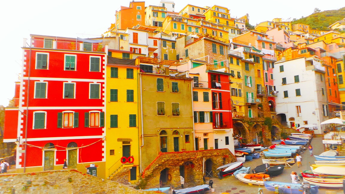 Trenle sırasıyla Monteresso, Vernezza, Cornigla ve Manarola’dan geçtikten sonra Riamaggiore ye ulaşıyoruz. Trenden indikten sonra yaklaşık 100 metrelik bir tünelden valizlerimizle yürüyerek otelimize ulaştık. Hemen dışarı çıktık. Küçük bir köy olan Riamaggiore’nin yine küçük bir balıkçı barınağı ve iskelesi var. Manzara ve iskelenin çevresindeki renkli yapılar, etraftaki karaya çekilmiş tekneler ve deniz, sahnelenmekte olan bir operanın sahne dekoruna benziyor.