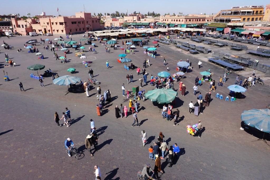 Fas’ın en renkli turistik meydanı şüphesiz Marakeş’de bulunan Jemaa El Fna meydanı. Yani kıyamet meydanı. Bu meydan UNESCO tarafından dünya kültürel mirası listesine alınmış tek şehir meydanı. Ortaçağdan kalmış bir meydan görünümünde. Hem gündüzleri, hem de geceleri inanılmaz renkli ve hareketli. Meydanda hikaye anlatıcıları, kınacılar, müzisyenler, geleneksel dansçılar, yılan oynatıcıları, maymuncular, kumarbazlar, büyücüler, kebapcılar, tatlıcılar, manavlar, lokumcular. Birde ilginç şapkaları ve bakır bardakları ile sucular. Tüm bu satıcılar fotoğraflarını çektiğiniz zaman eğer görürlerse yanınıza gelip bahşişlerini mutlaka istiyorlar.